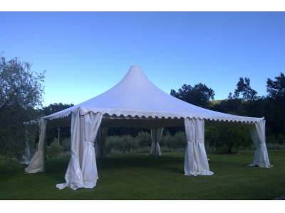 Il telaio delle strutture è in alluminio anodizzato ad alta resistenza, i teli tetto sono realizzati in poliestere con spalmatura in PVC ignifugo, così come i tamponamenti laterali scorrevoli, di colore bianco e con inserti finestrati in crystal stile inglese.